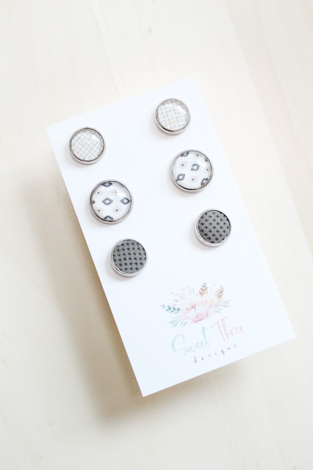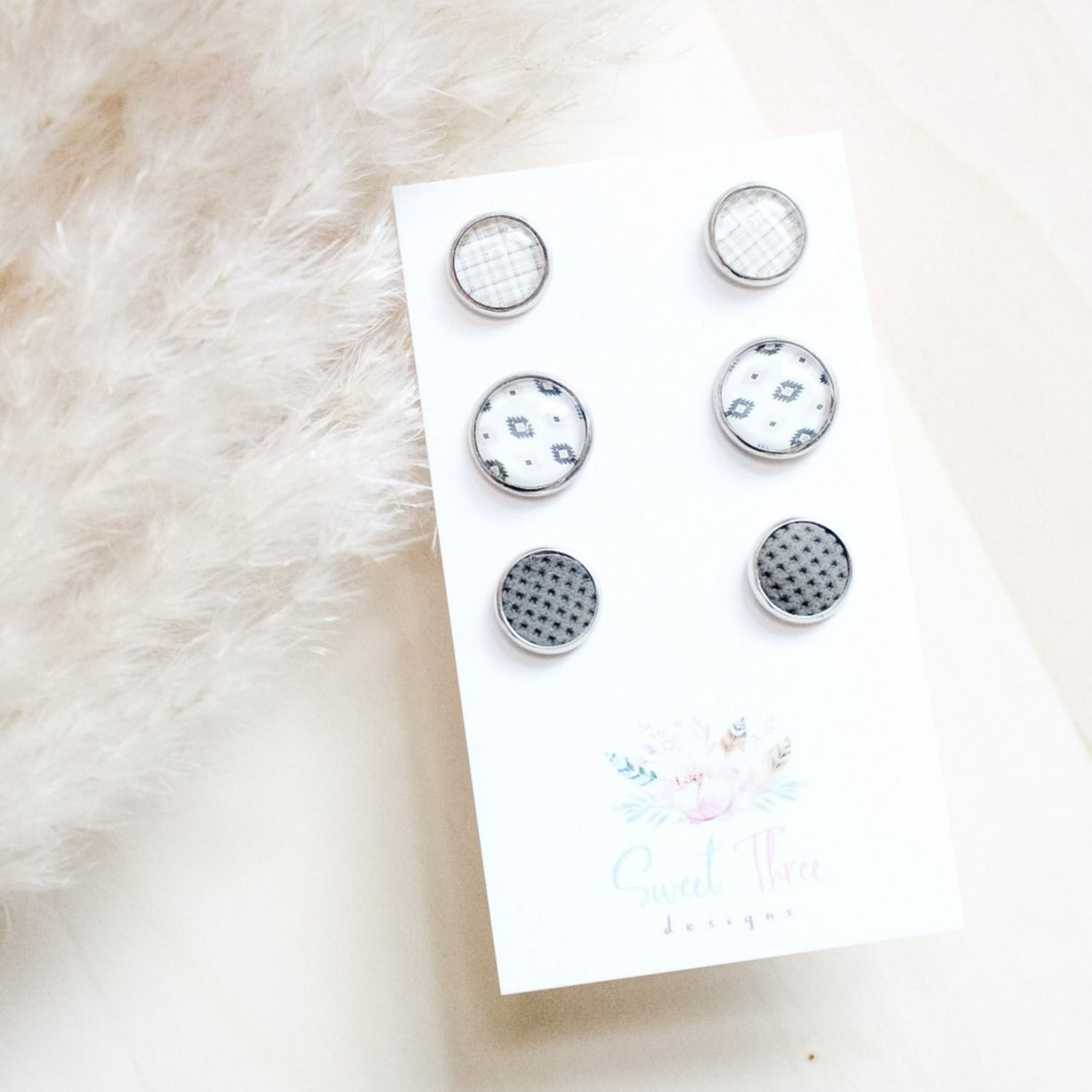 A trio of two different styles of earrings with versatile colours that coordinate with all our favourite neutral clothing pieces. Set is a combination of two sizes of glass stud and our new faux suede textured studs.