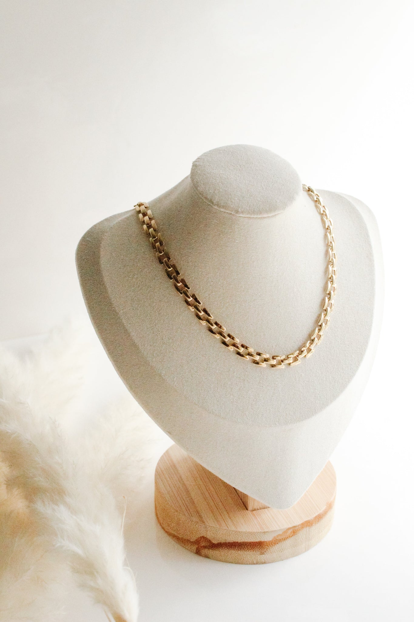 Bold, modern, and unapologetically chic. The Khloe Block Chain features flat, structured links that make a statement all on their own. Crafted in durable stainless steel with a luxe gold finish, it’s your new go-to for elevating everyday looks or layering with your favorites.