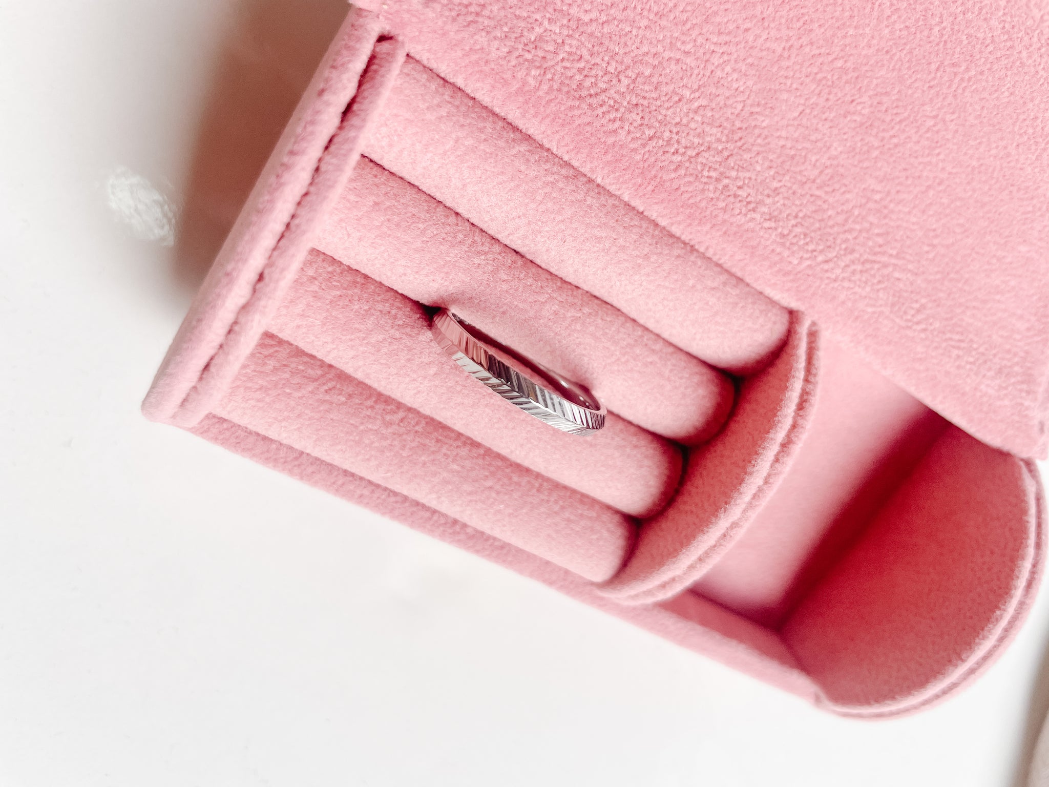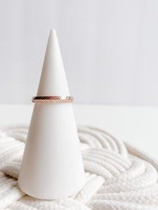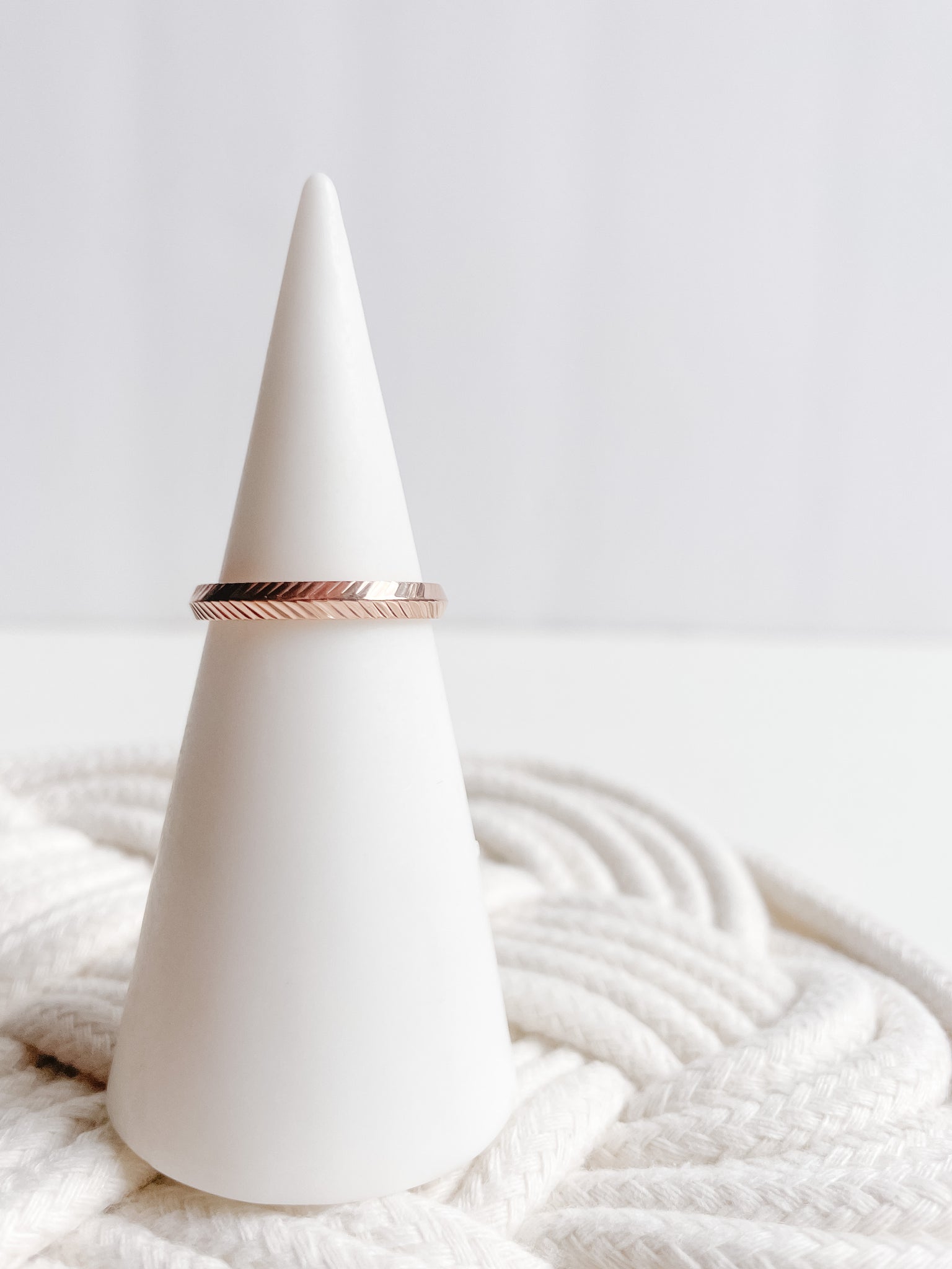 This Serene Stacking Ring offers a classic design with a twist. Crafted using a durable metal, this ring features a simple band with intricate herringbone detail that makes it stand out. This ring is a customer favorite and perfect for everyday wear.