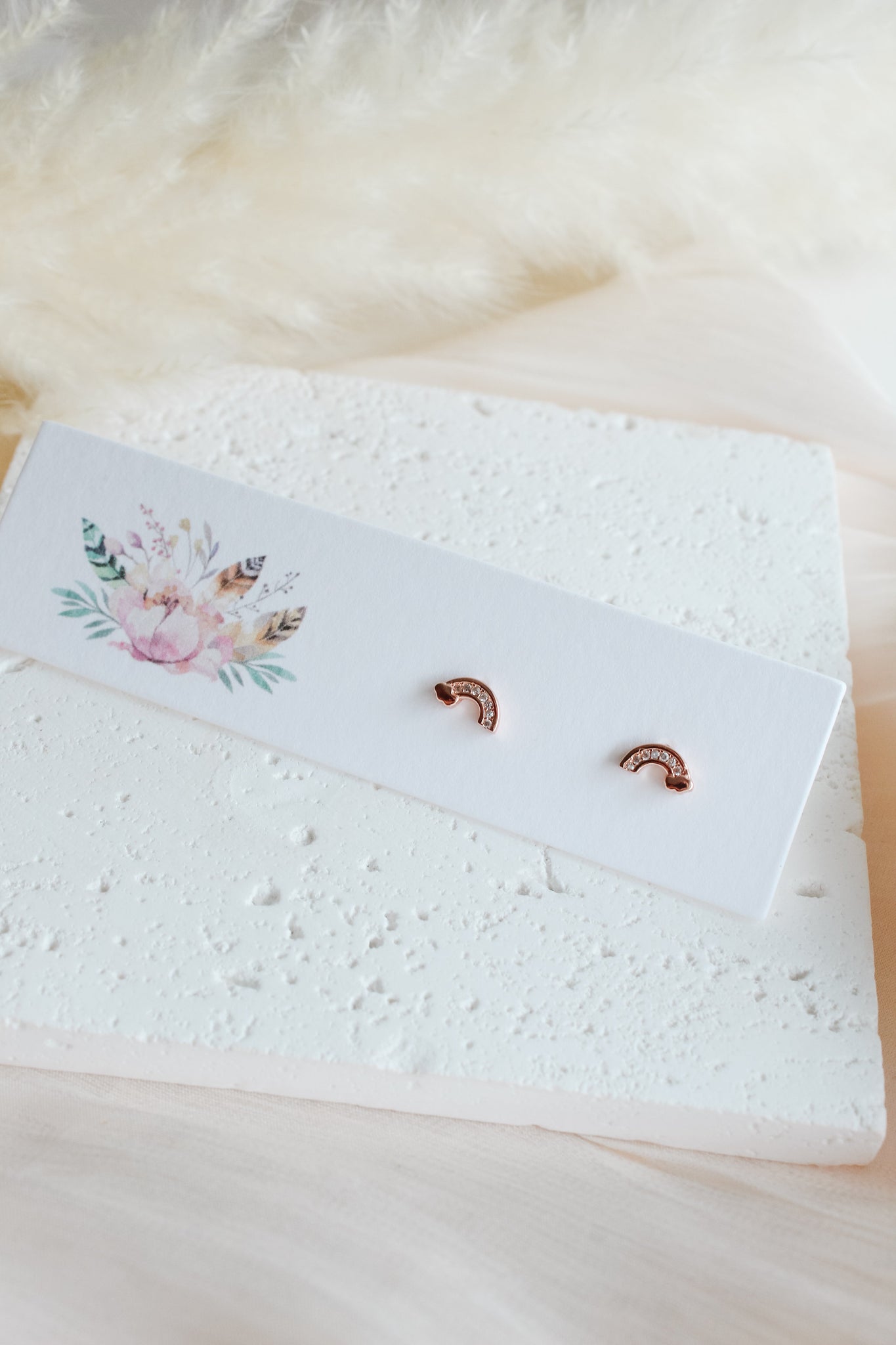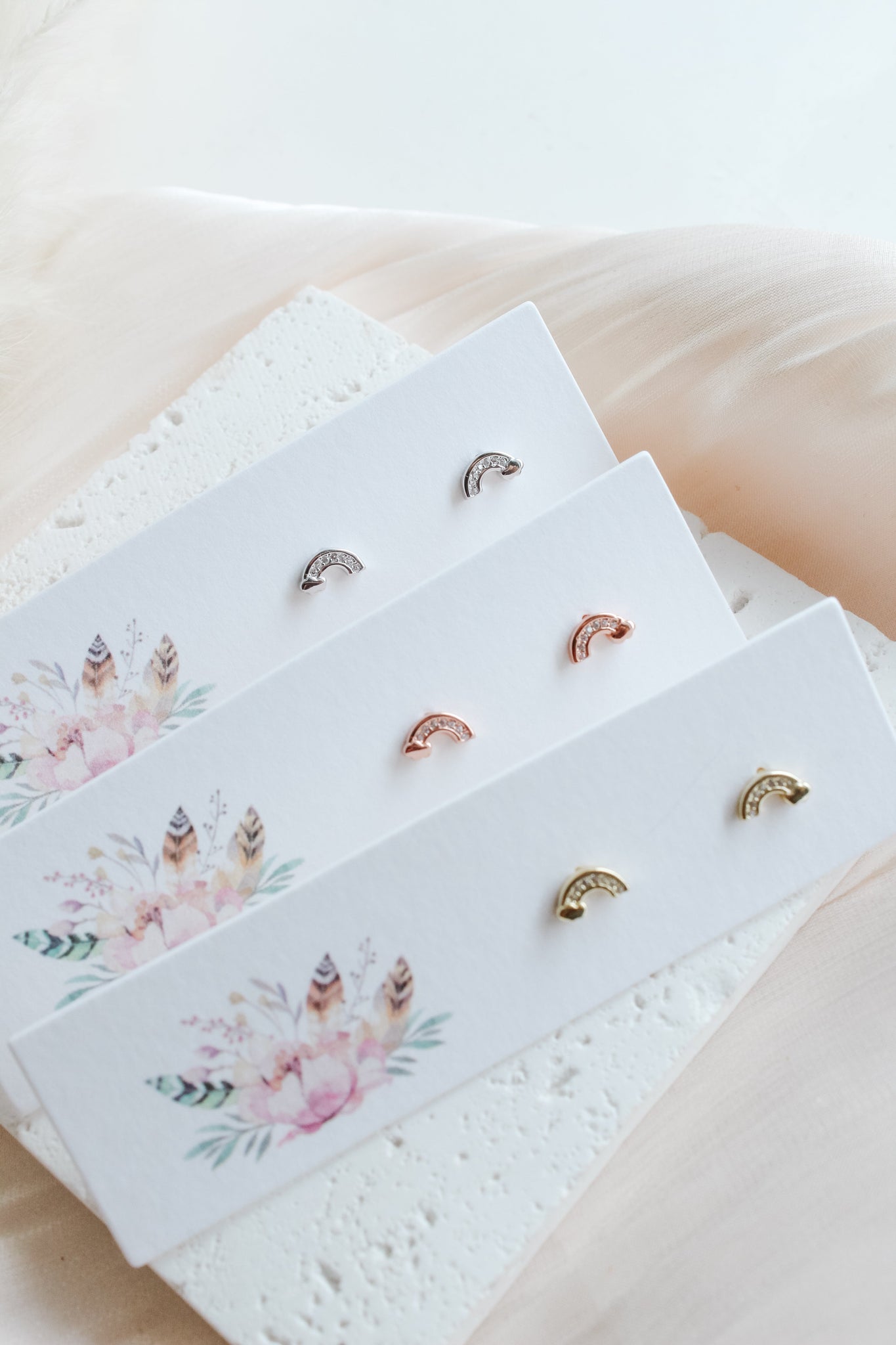 A subtle pop of joy for your everyday stack. These dainty rainbow studs are crafted in sterling silver and feature delicate cubic zirconia accents for just the right amount of sparkle. Lightweight, hypoallergenic and available in three colour finishes. Perfect for first, second or even third piercings.